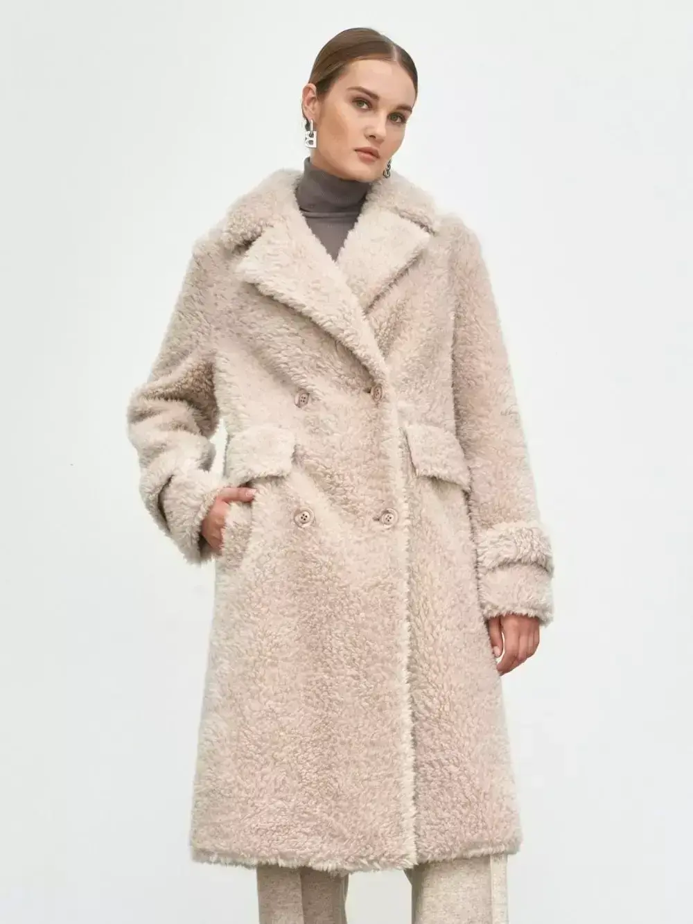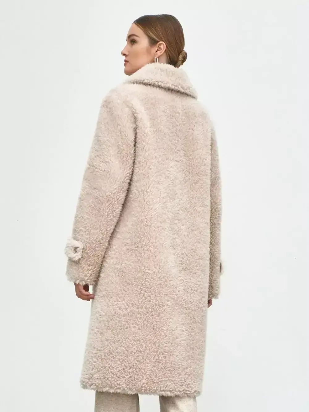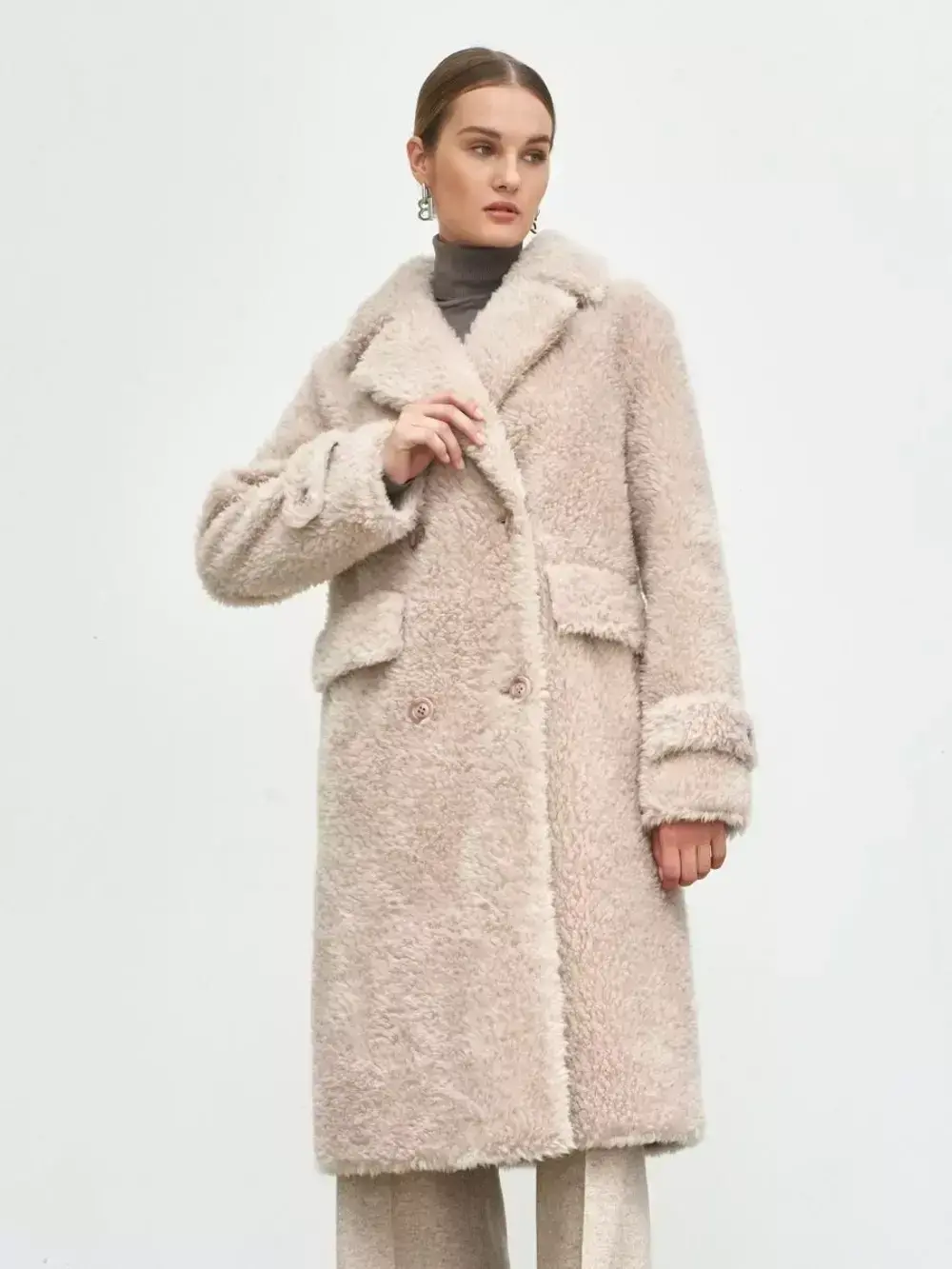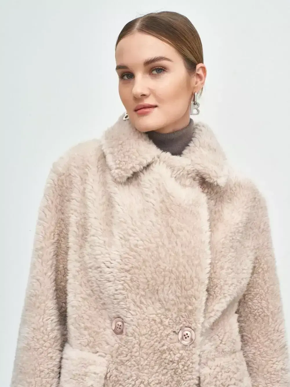 Премиальная шуба «Чебурашка» выполнена из 100% шерсти мериноса. Она обладает английским воротником, удобными прорезными карманами и застежками на пуговицах. Пальто имеет прямой крой и силуэт, выполненный в стиле небольшого оверсайз. Шерсть мериноса прекрасно пропускает воздух, обеспечивая комфорт в любую погоду.