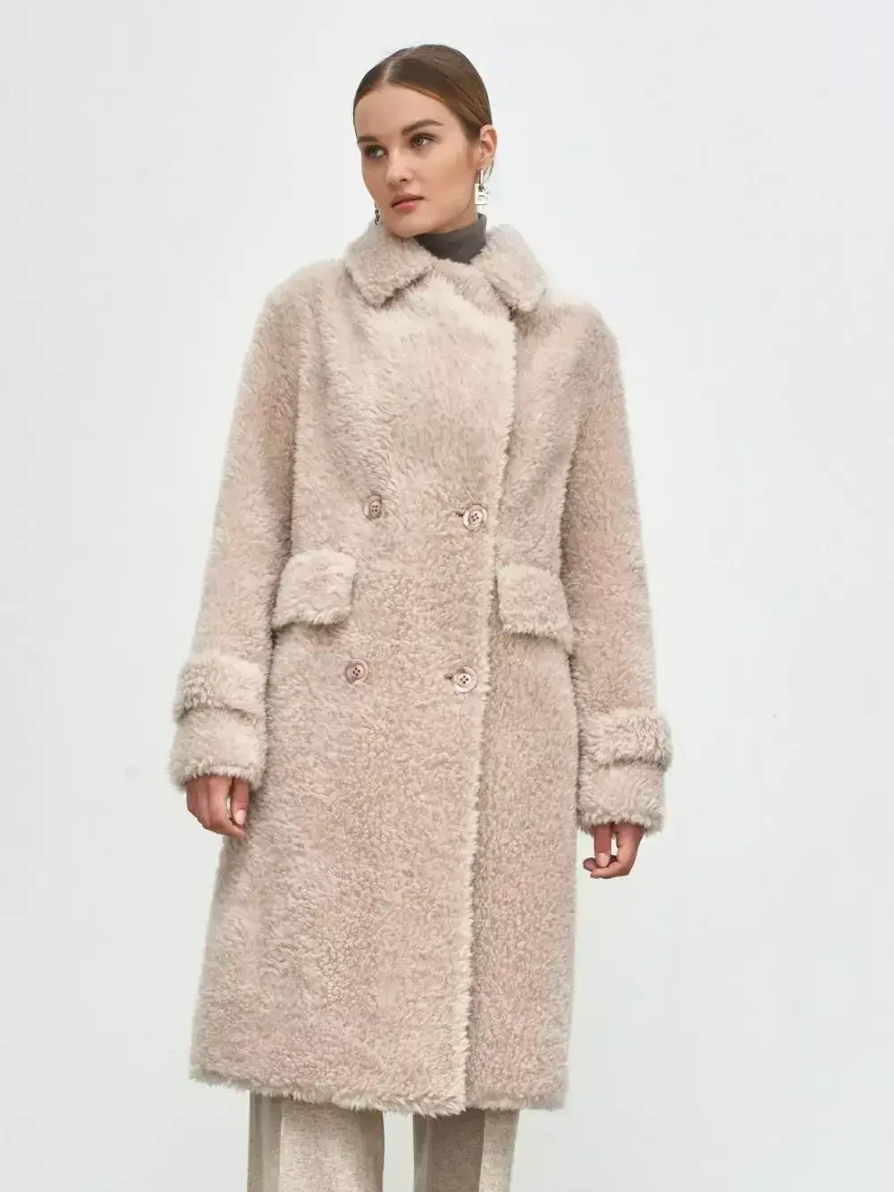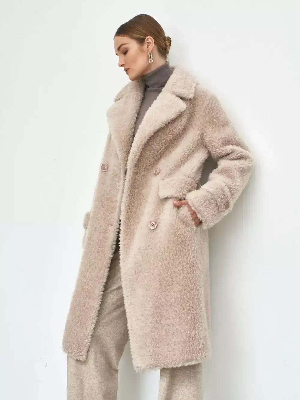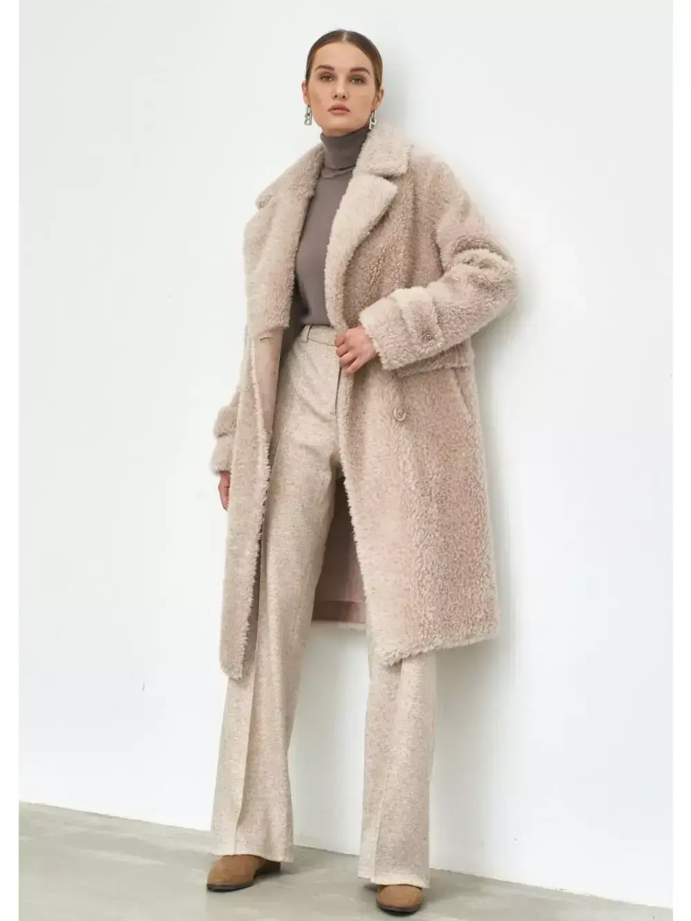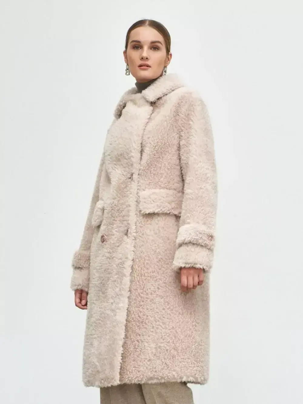 Премиальная шуба «Чебурашка» выполнена из 100% шерсти мериноса. Она обладает английским воротником, удобными прорезными карманами и застежками на пуговицах. Пальто имеет прямой крой и силуэт, выполненный в стиле небольшого оверсайз. Шерсть мериноса прекрасно пропускает воздух, обеспечивая комфорт в любую погоду.