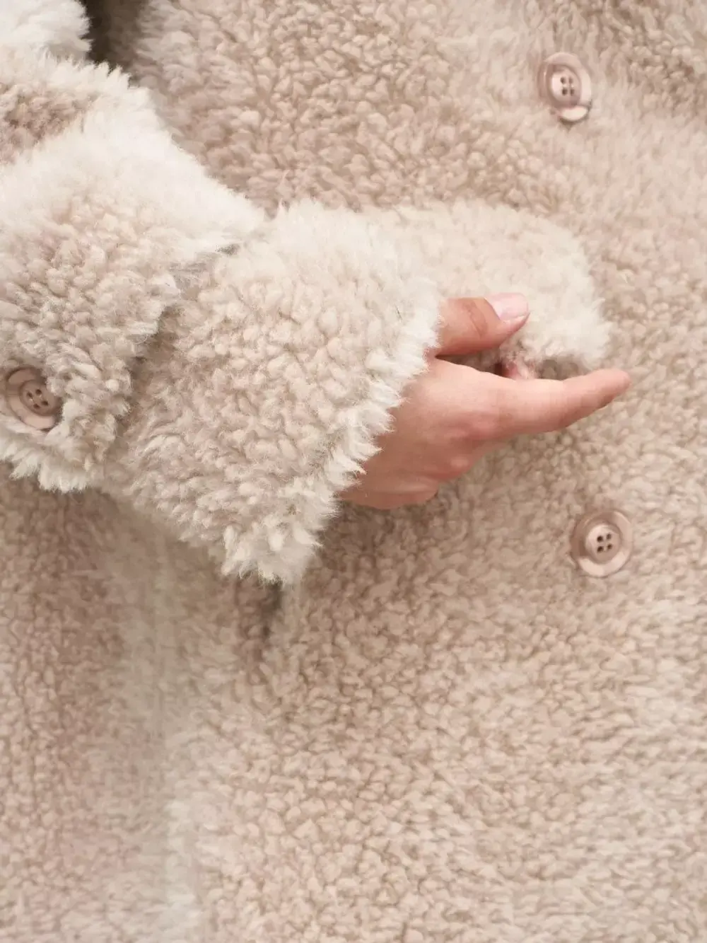 Материал шубы состоит из трех слоев, которые прочно соединены между собой: ворс из овечьей шерсти, трикотажная основа и искусственная замша. Благодаря этому изделие отличается неприхотливостью в уходе: его легко очищать от загрязнений, и оно устойчиво к образованию потертостей.