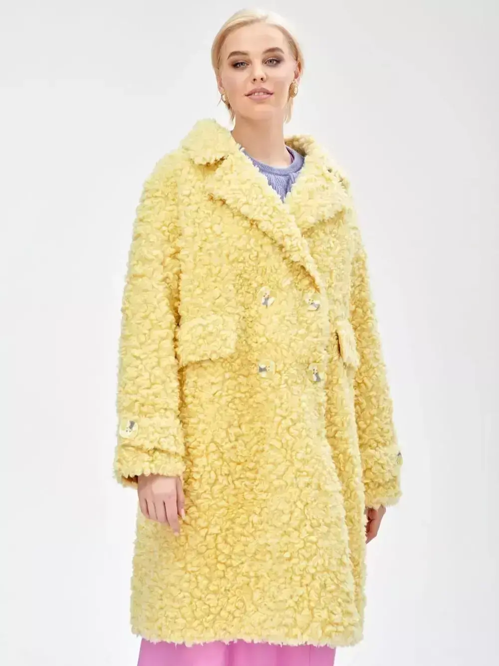 Шубку «Чебурашка» можно носить как мягкую зимнюю одежду, так и весной и осенью в качестве двубортного пальто (демисезонного). Комфортная температура эксплуатации составляет от +5 до -25 градусов Цельсия.