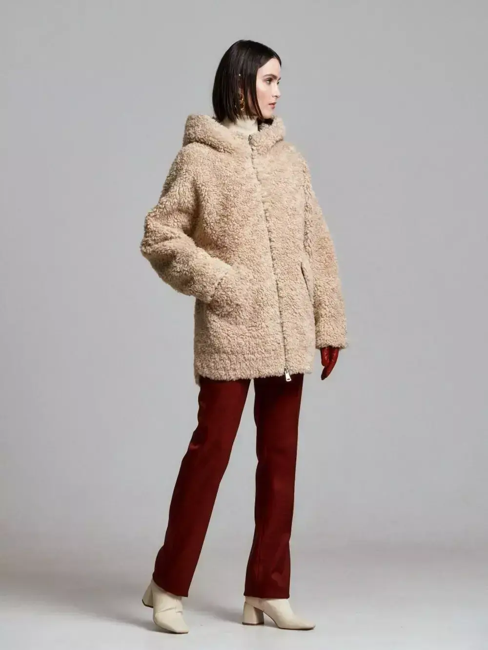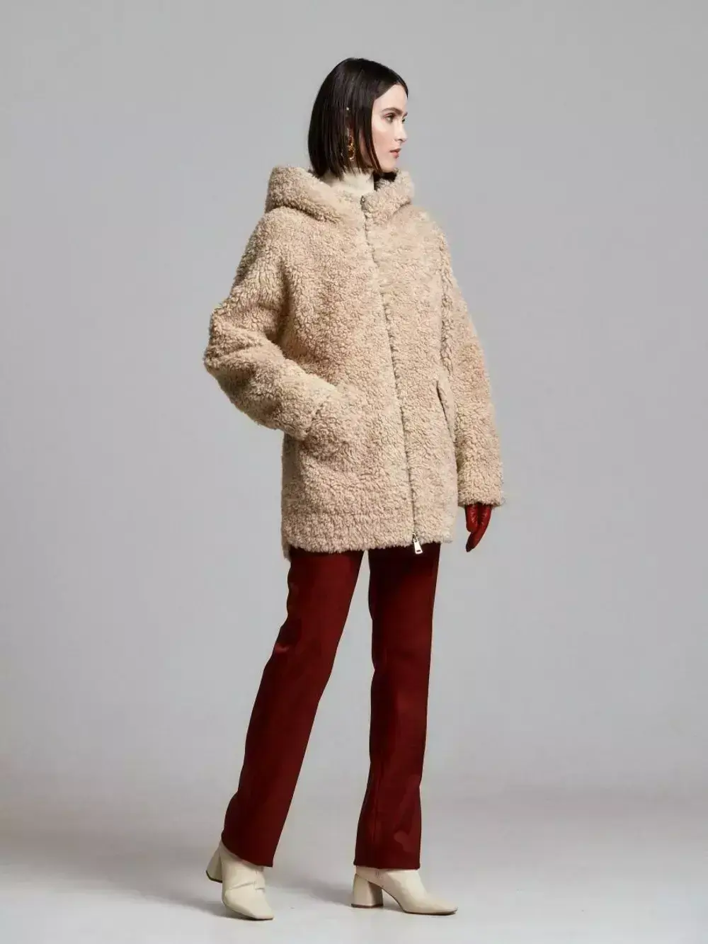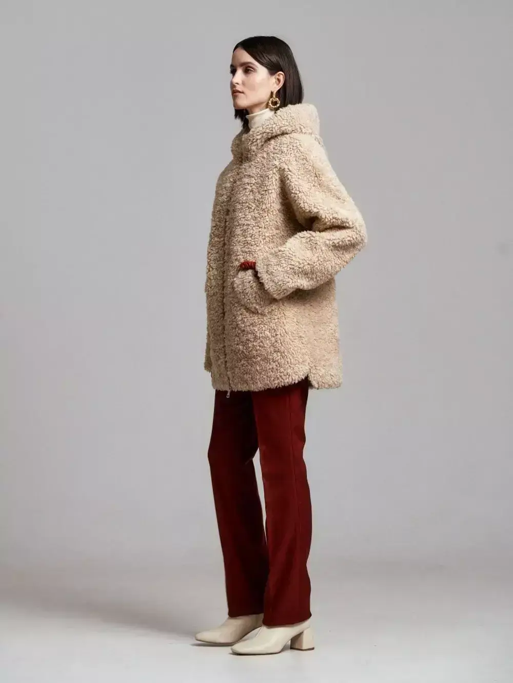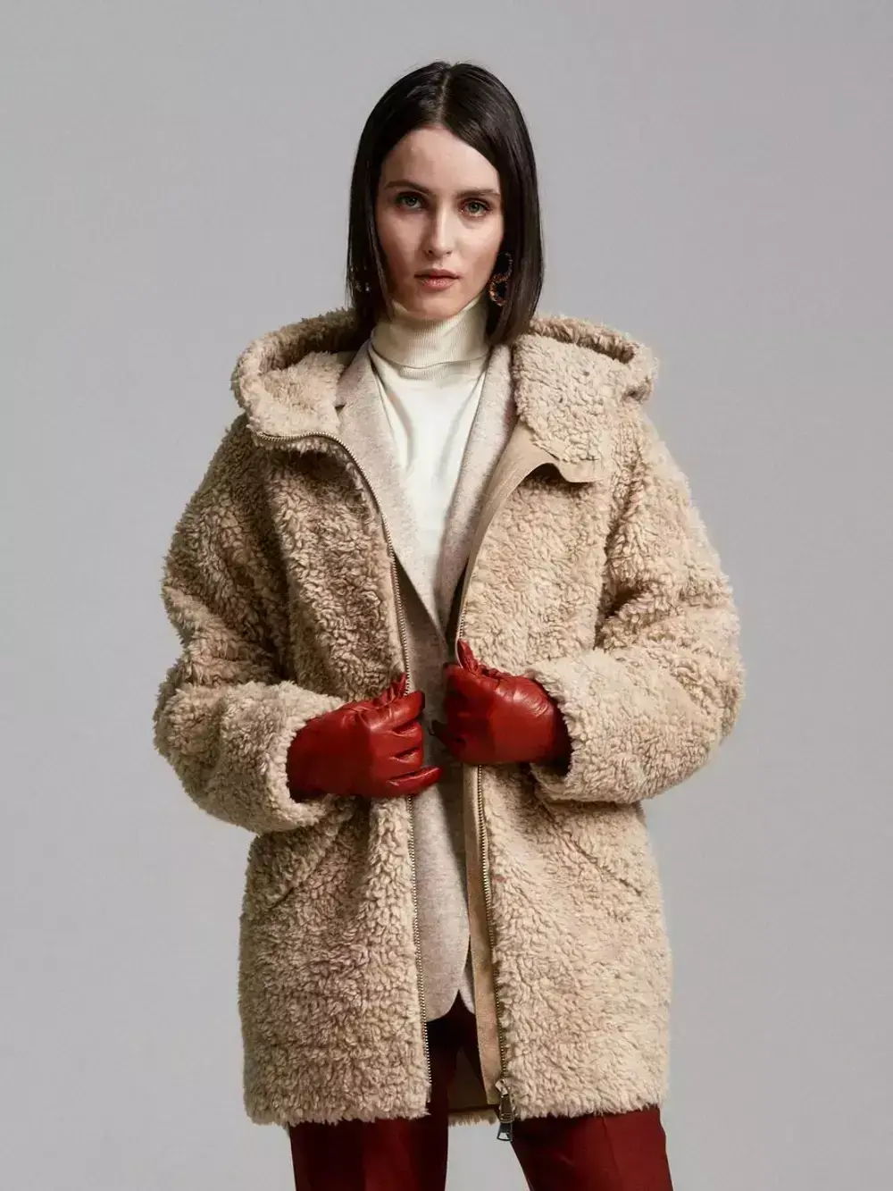 Куртка из искусственного Люкс эко - меха, состав которого 15% шерсть мериноса, 85% полиэфир с капюшоном имеет прямой силуэт и умеренный объём. Шубку Тедди можно носить как весной, так и осенью (демисезонное) в качестве куртки. Несъёмный капюшон, удобные прорезные карманы с декоративными клапанами и центральная застежка - молния с двойным бегунком. Куртка прямого кроя, выполнена в стиле оверсайз (oversize). Рукав втачной, со спущенным плечом, полной длины. Отлично подойдет молодым девушкам, мамам, женам и беременным женщинам.