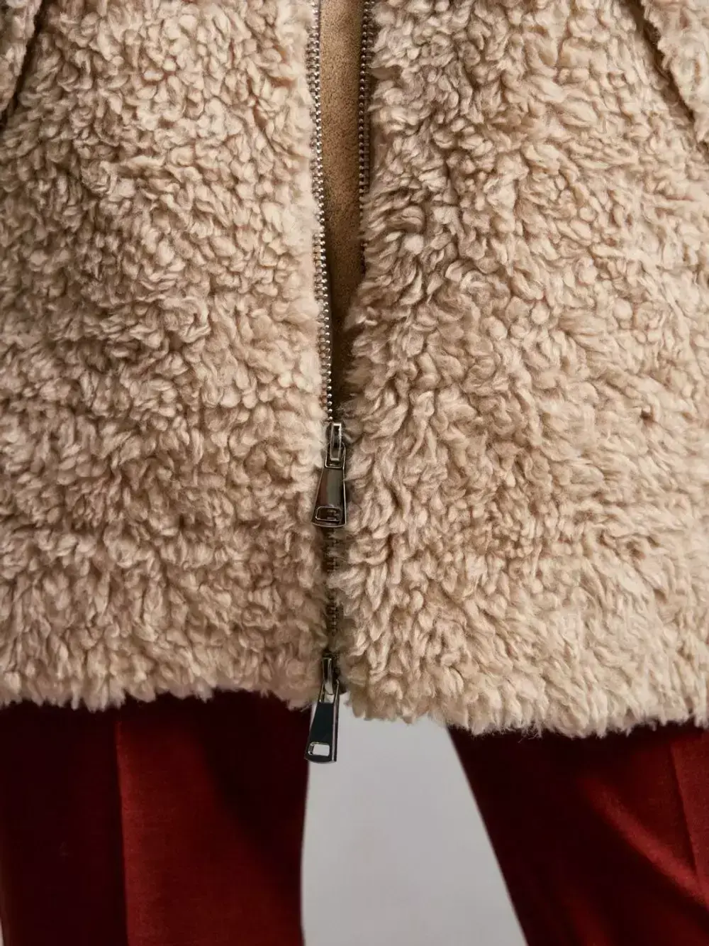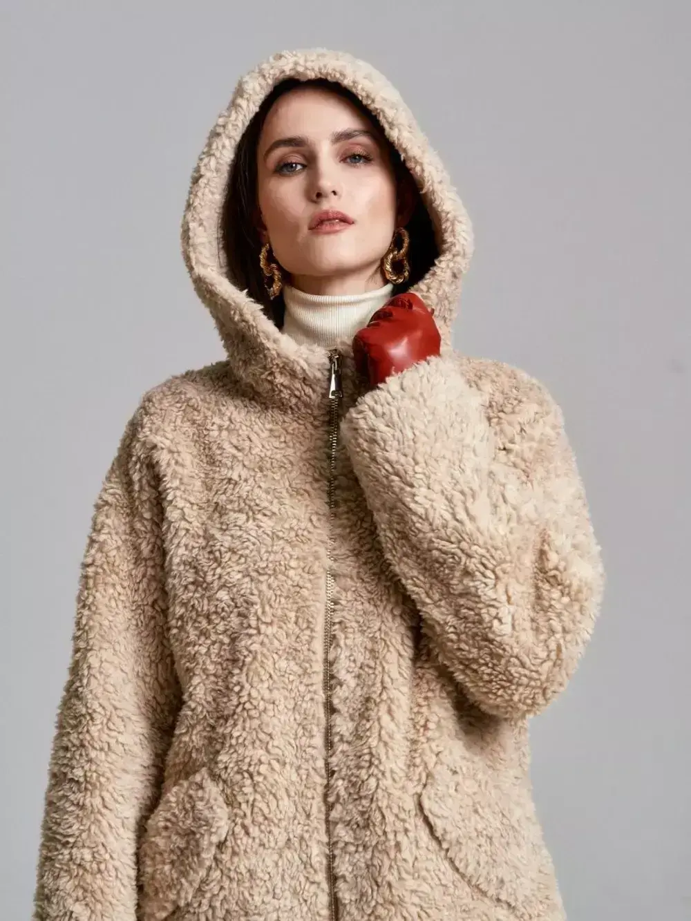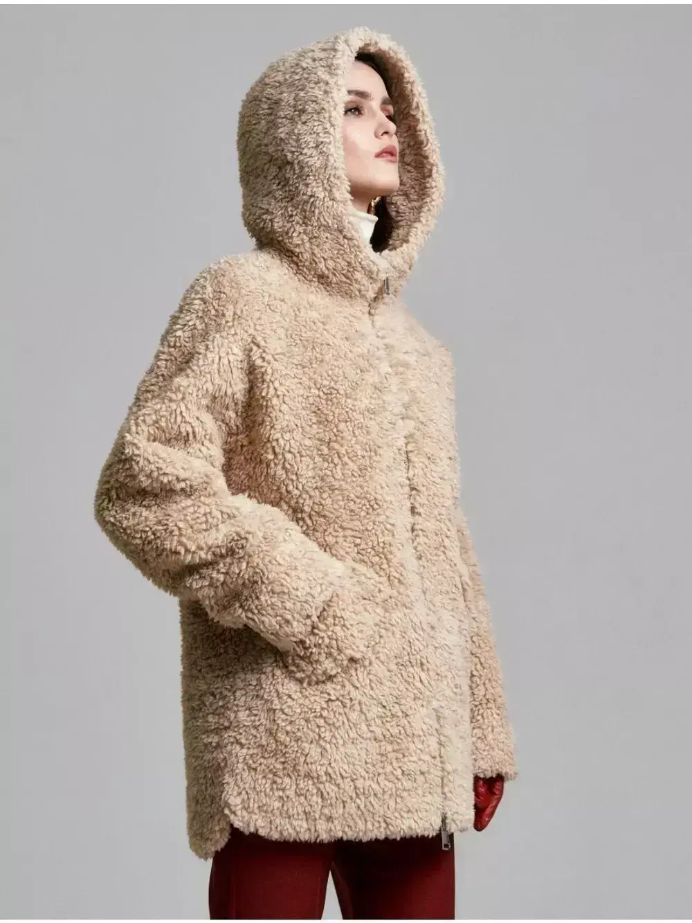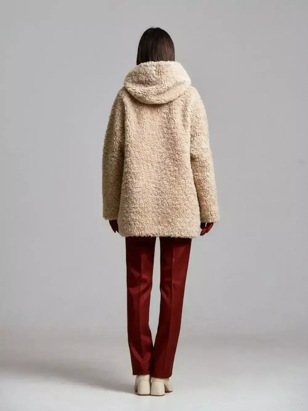 Куртка из искусственного Люкс эко - меха, состав которого 15% шерсть мериноса, 85% полиэфир с капюшоном имеет прямой силуэт и умеренный объём. Шубку Тедди можно носить как весной, так и осенью (демисезонное) в качестве куртки. Несъёмный капюшон, удобные прорезные карманы с декоративными клапанами и центральная застежка - молния с двойным бегунком. Куртка прямого кроя, выполнена в стиле оверсайз (oversize). Рукав втачной, со спущенным плечом, полной длины. Отлично подойдет молодым девушкам, мамам, женам и беременным женщинам.