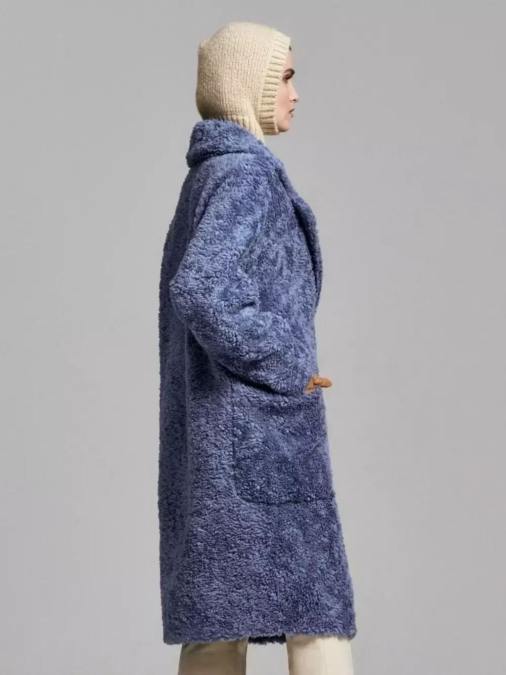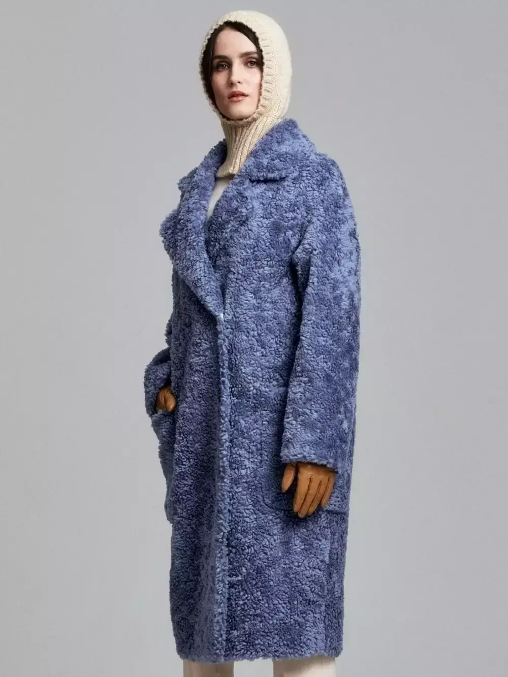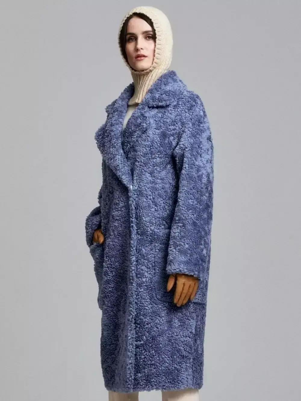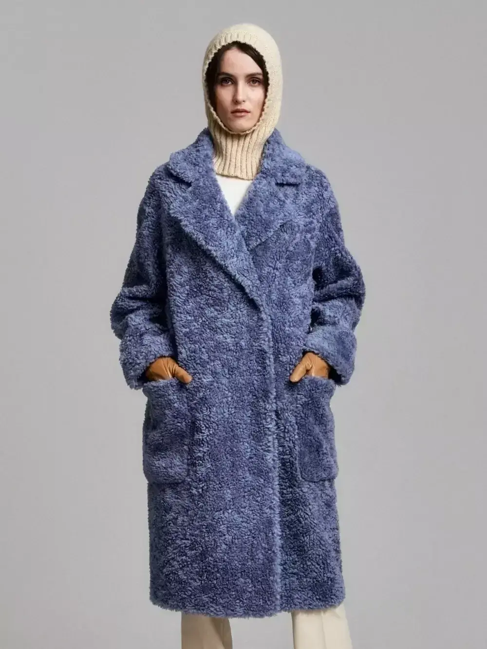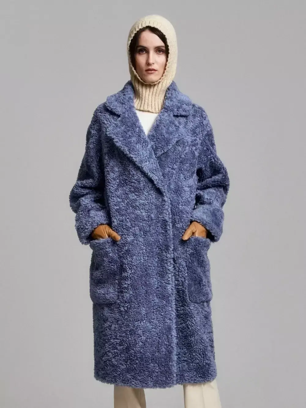 Полупальто из инновационного брендового шерстяного меха Merino WoolFur состоит из 100% шерсти мериноса. Двубортное пальто имеет свободный силуэт (оверсайз). Рукав со спущенным плечом полной длины. Английский воротник можно полностью застегнуть под горло на пуговицу. Изнаночная сторона выполнена из искусственной замши, которая приятна ощупь, не "холодит", создает дополнительный слой защищающий от ветра. Удобные металлические застёжки в виде скрытых кнопок. Глубокие накладные карманы. Пошив и обработка конструктивных деталей выполнена на премиальном уровне с соблюдением строгих правил технологии производства верхней одежды.