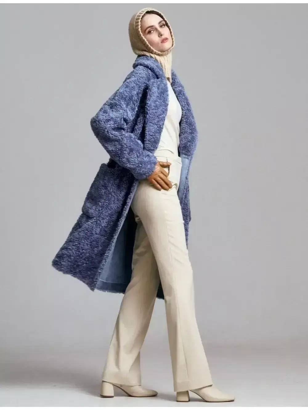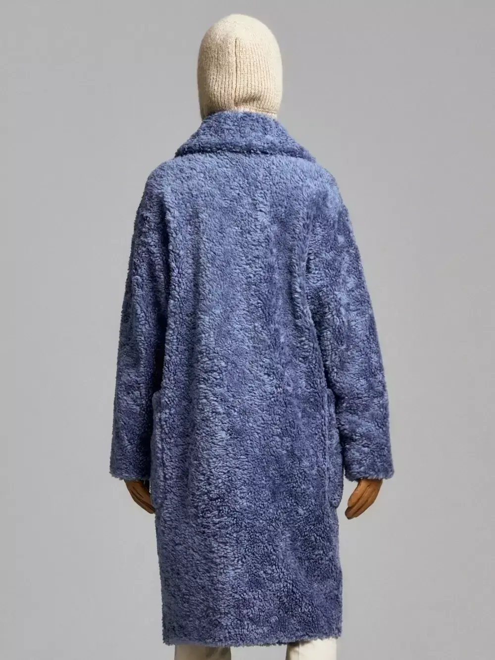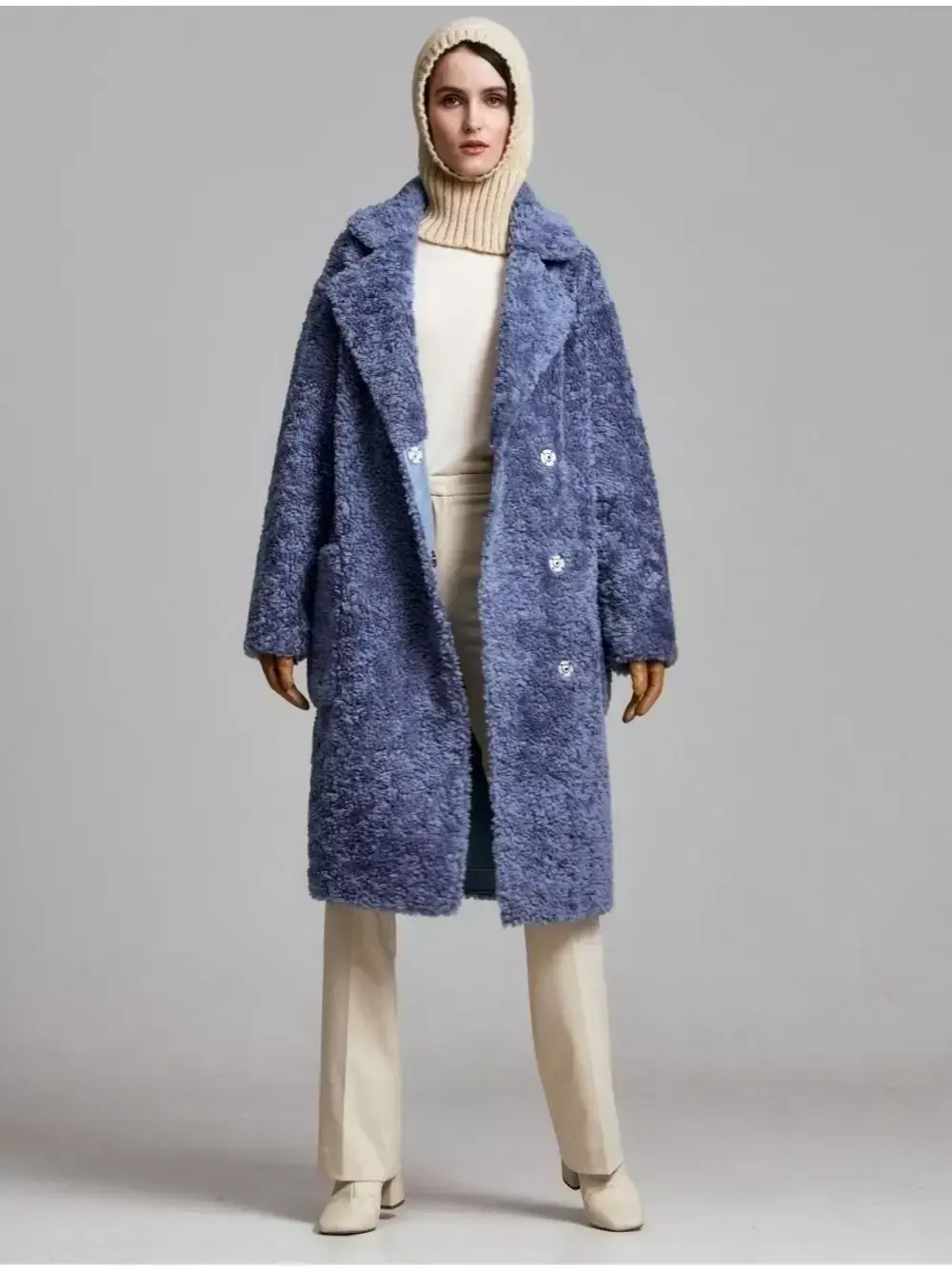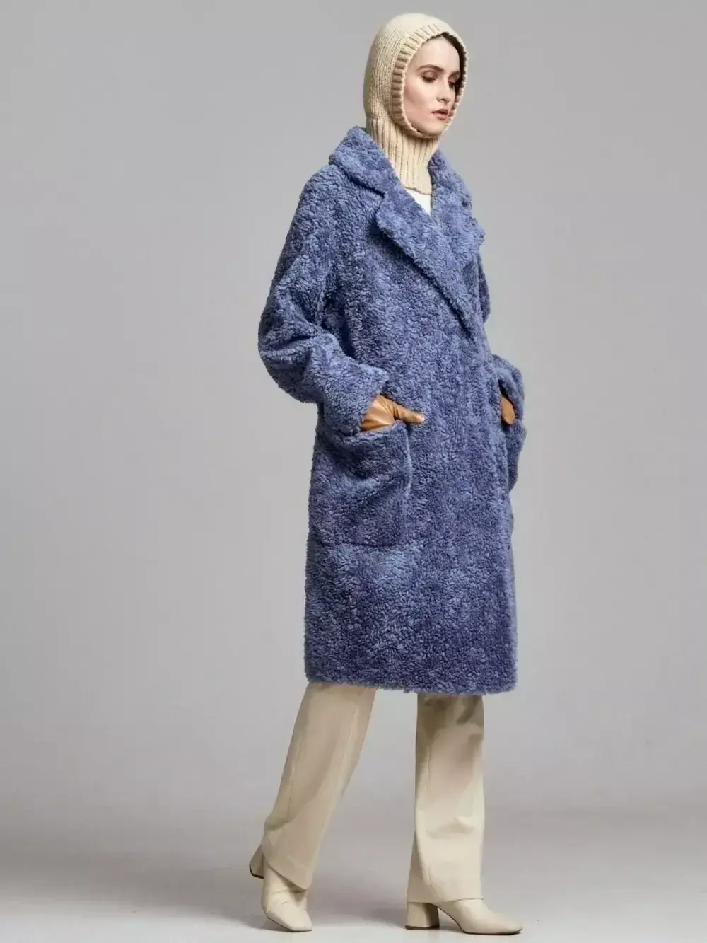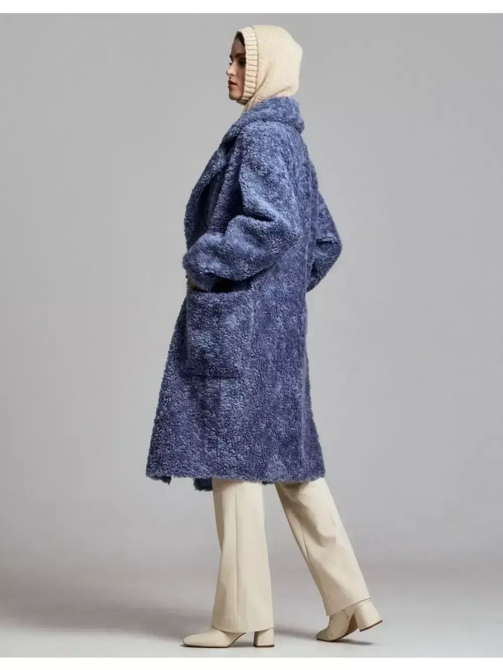 Полупальто из инновационного брендового шерстяного меха Merino WoolFur состоит из 100% шерсти мериноса. Двубортное пальто имеет свободный силуэт (оверсайз). Рукав со спущенным плечом полной длины. Английский воротник можно полностью застегнуть под горло на пуговицу. Изнаночная сторона выполнена из искусственной замши, которая приятна ощупь, не "холодит", создает дополнительный слой защищающий от ветра. Удобные металлические застёжки в виде скрытых кнопок. Глубокие накладные карманы. Пошив и обработка конструктивных деталей выполнена на премиальном уровне с соблюдением строгих правил технологии производства верхней одежды.