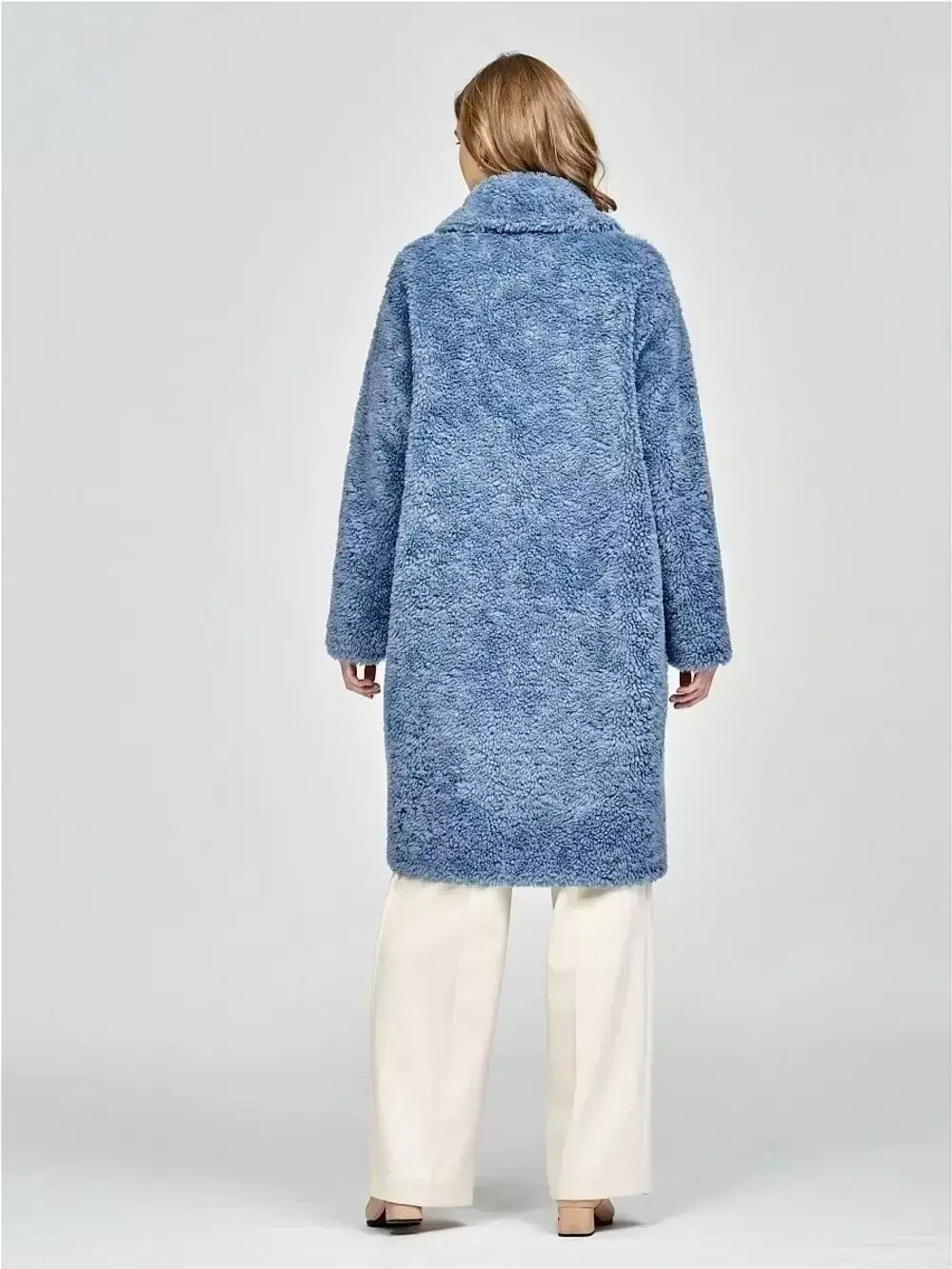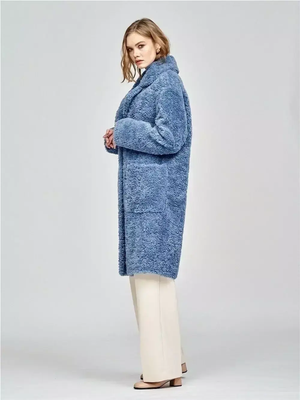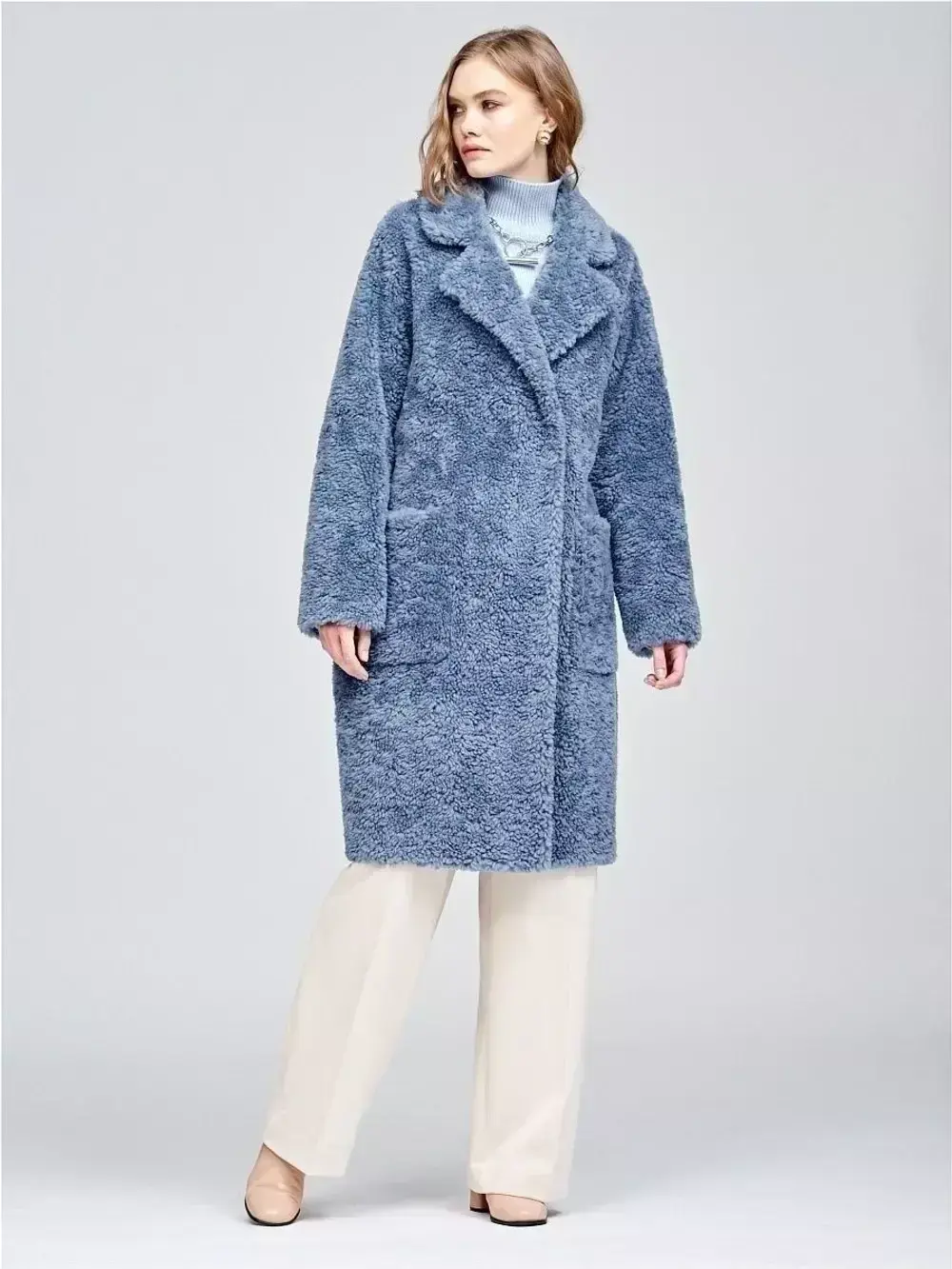 - Шуба женская из шерсти мериноса чебурашка тедди, синяя, SilverFox