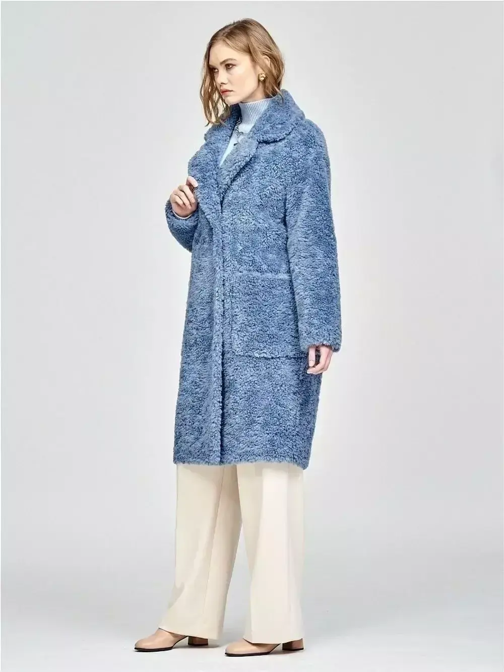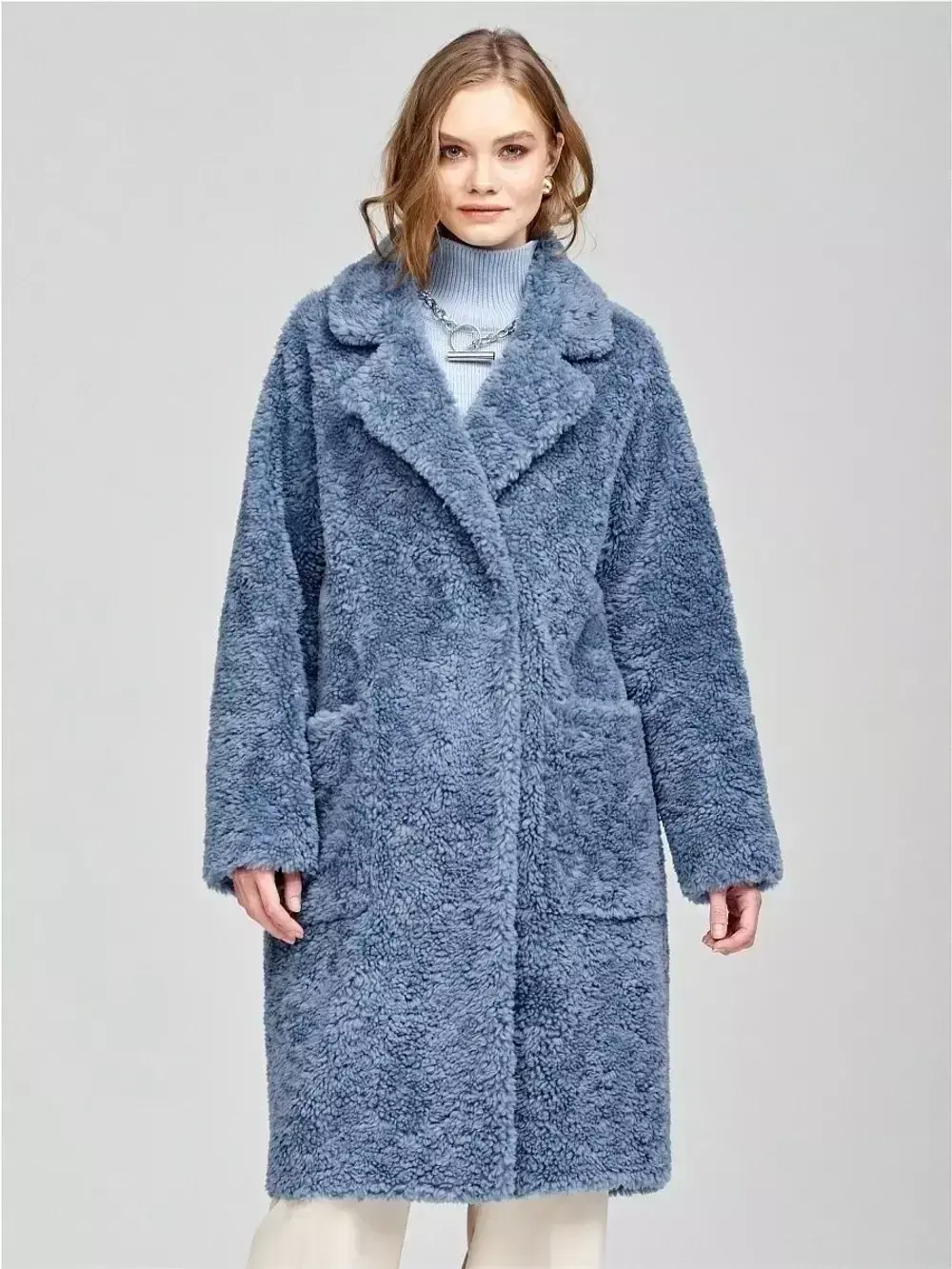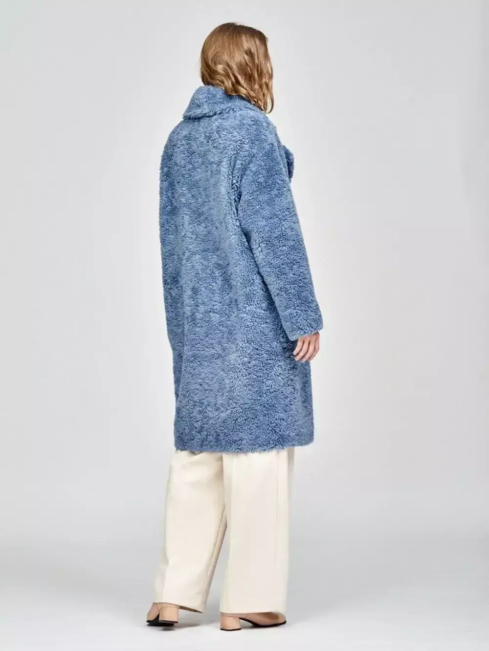 - Шуба женская из шерсти мериноса чебурашка тедди, синяя, SilverFox